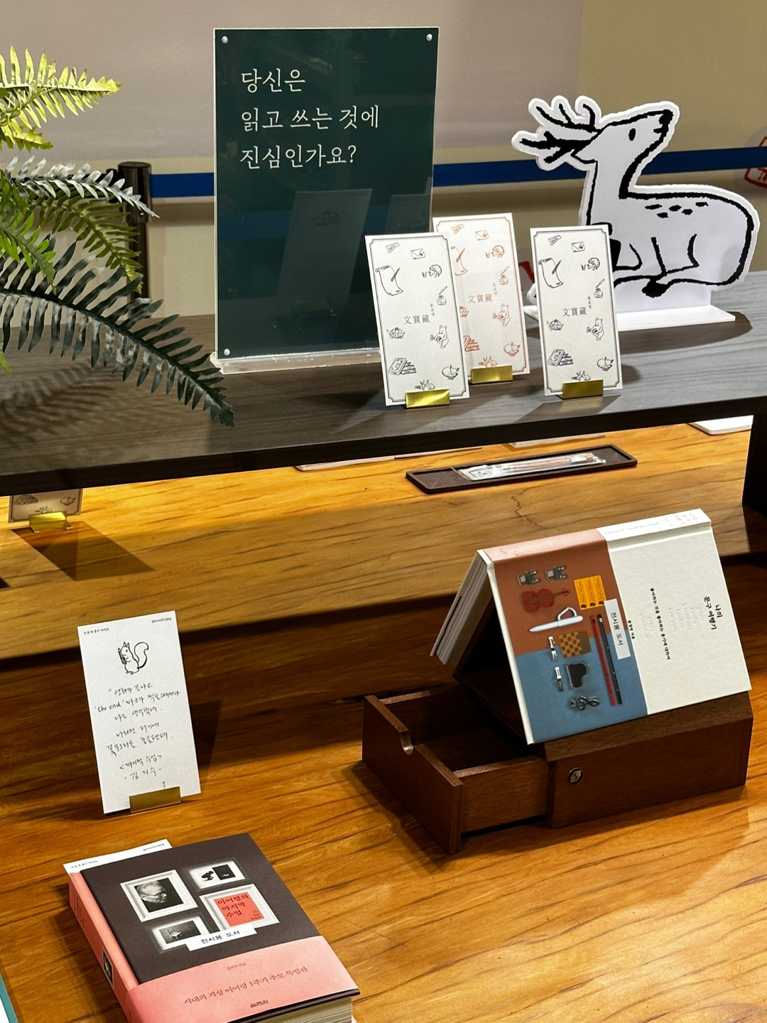 책과 문구를 자연스레 이은 전시로 과거의 문방사우인 붓, 먹, 벼루, 종이를 현재의 문방사우인 연필, 지우개, 펜, 종이로 재해석했다는 점이 재밌었다. 연필(문)에는 다람쥐, 지우개(방)에는 사슴, 펜(사)에는 거북이, 종이(우)에는 제비를 각각 매치하여 스토리텔링한 점도 독특해서 좋았다.