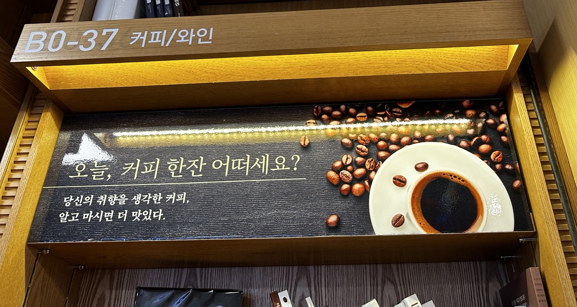 휙 지나치다 발견한 코너 설명 카피, '오늘, 커피 한잔 어떠세요? 당신의 취향을 생각한 커피, 알고 마시면 더 맛있다.'