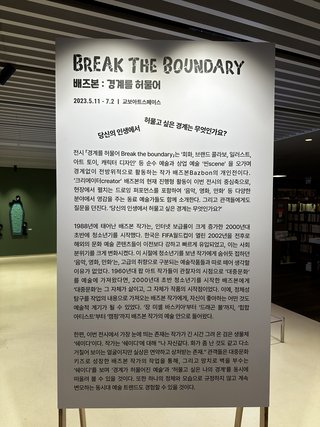 어떤 애니메이션? 캐릭터에 대한 서사와, 관련 그림들이 개방된 공간에 전시되어 있었다. 엄청나게 인상 깊지는 않았나 보다, 잘 기억이 안나는 거 보니. 그냥 교보문고 둘러보다가 한 번쯤 훑고 지나가기 좋은 정도라고 생각한다.(개인적으로)