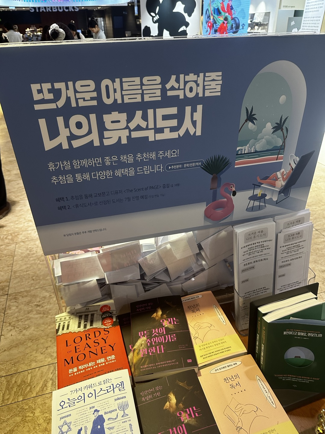 교보문고가 갖고 있는 여유, 쉼, 휴식이라는 이미지를 시즈널 한 소재와 잘 합쳐졌고 실제 교보문고 방문자에게 책을 추천받을 수 있는 종이를 마련해서 더 의미가 있다고 생각했다. 뒤에 수북이 쌓여 있는 종이가 바로 그 추천도서 종이다.(볼펜은 안 보이길래 나는 개인적으로 참여 허들이 높다고 생각했는데,, 아닌가 보다 ㅎ)