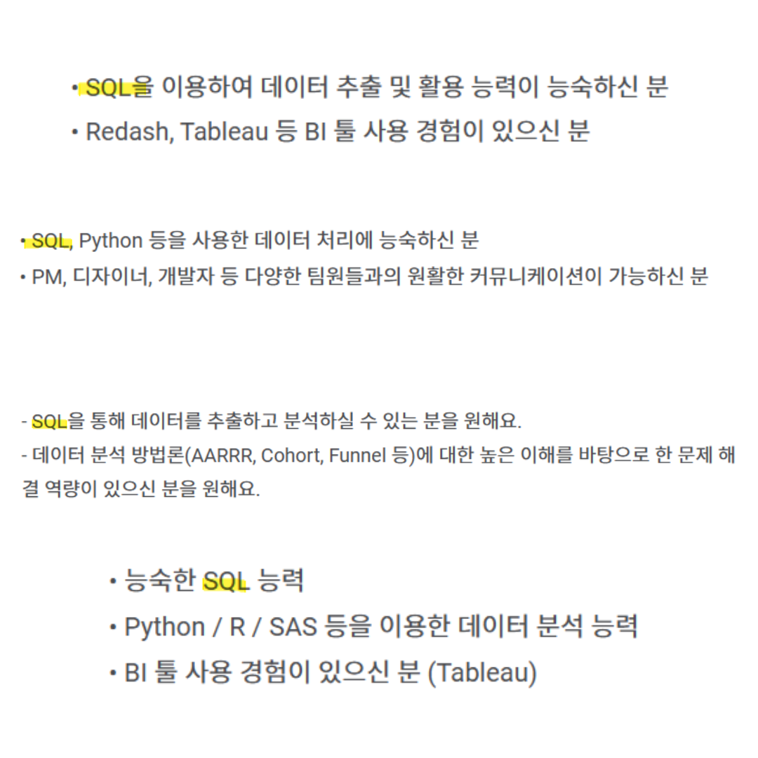 데이터분석가는 직접 데이터베이스에서 데이터를 뽑아서 분석해야하기 때문에 SQL 쿼리를 짤 수 있어야 합니다.